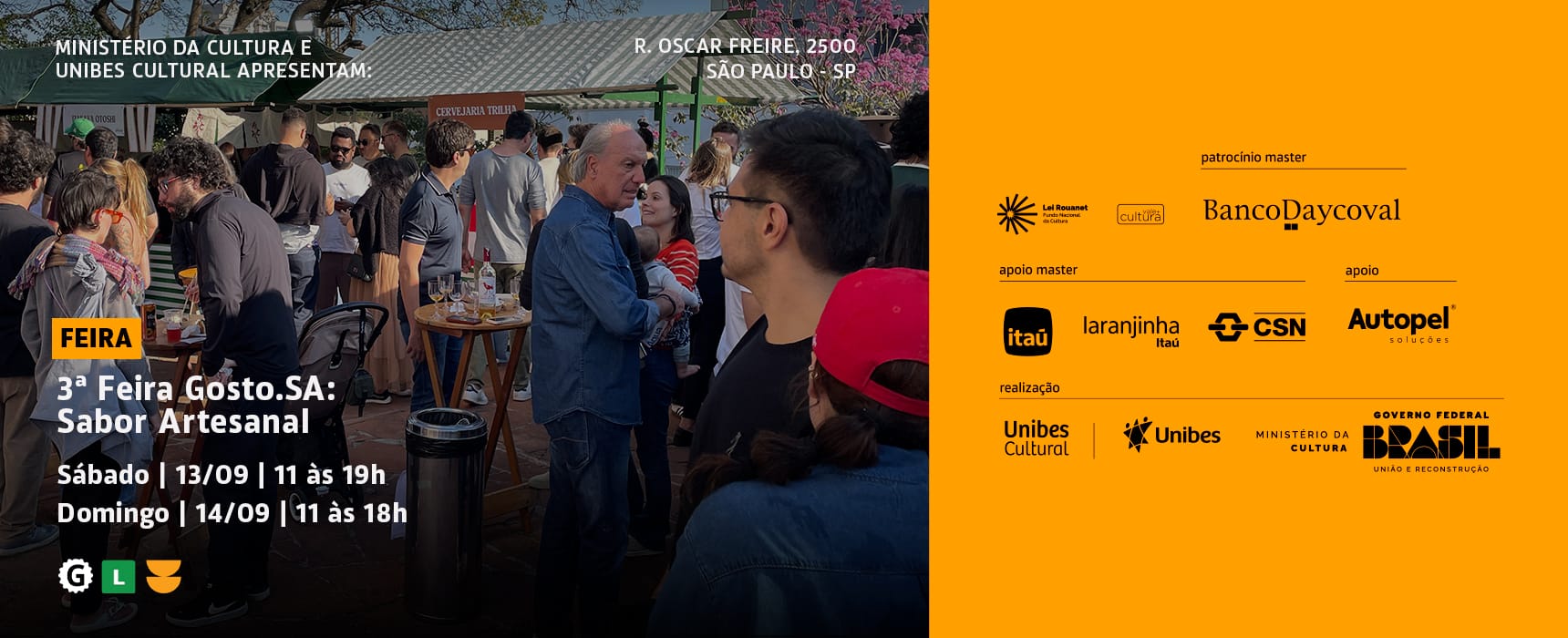 Nos dias 13 e 14 de setembro de 2025, a Unibes Cultural recebe a 3ª edição da Feira Gosto.SA – Sabor Artesanal, um evento gastronômico que celebra a autenticidade e a excelência dos produtos artesanais brasileiros, reunindo pequenos produtores, chefs renomados e apreciadores da chamada “comida de verdade” em um ambiente vibrante e acolhedor. Ao longo de dois dias, o público poderá vivenciar uma experiência completa, que combina degustação, aprendizado e conexão.