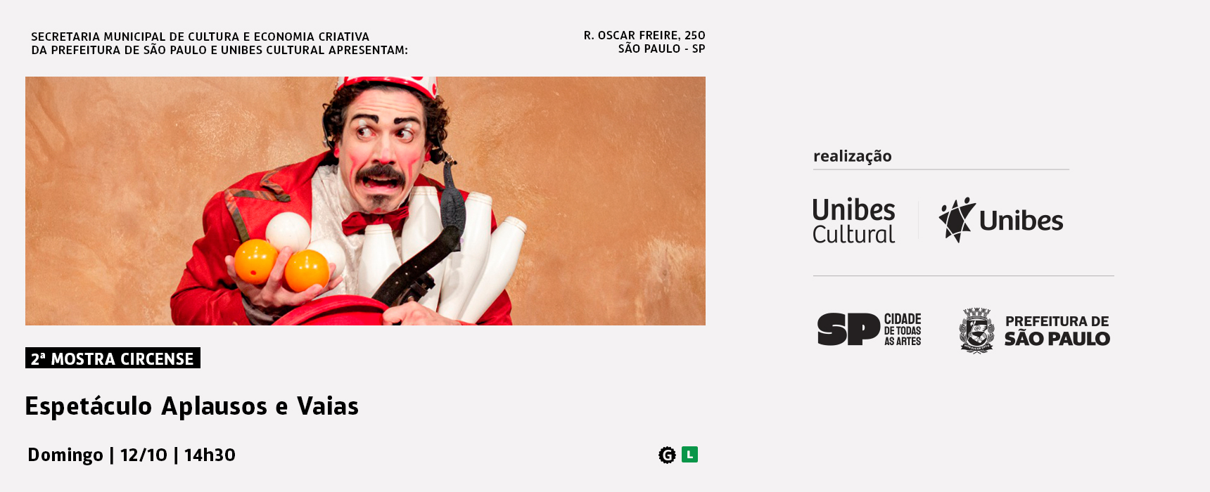 No dia 12 de outubro de 2025, às 14h30, a mostra traz o espetáculo Aplausos e Vaias, com o Palhaço Mendonça (Filipe Bregantim). Criado para os espaços de rua, o espetáculo mantém os ritos clássicos do circo — o chamamento, a roda, os números de virtuosismo e a grande promessa — em uma linguagem totalmente analógica, sem efeitos especiais. Entre números de caçapa, manipulação de bolas e magia cômica, Mendonça propõe um encontro direto com o público, que é convidado a participar ativamente, vaiando ou aplaudindo.
