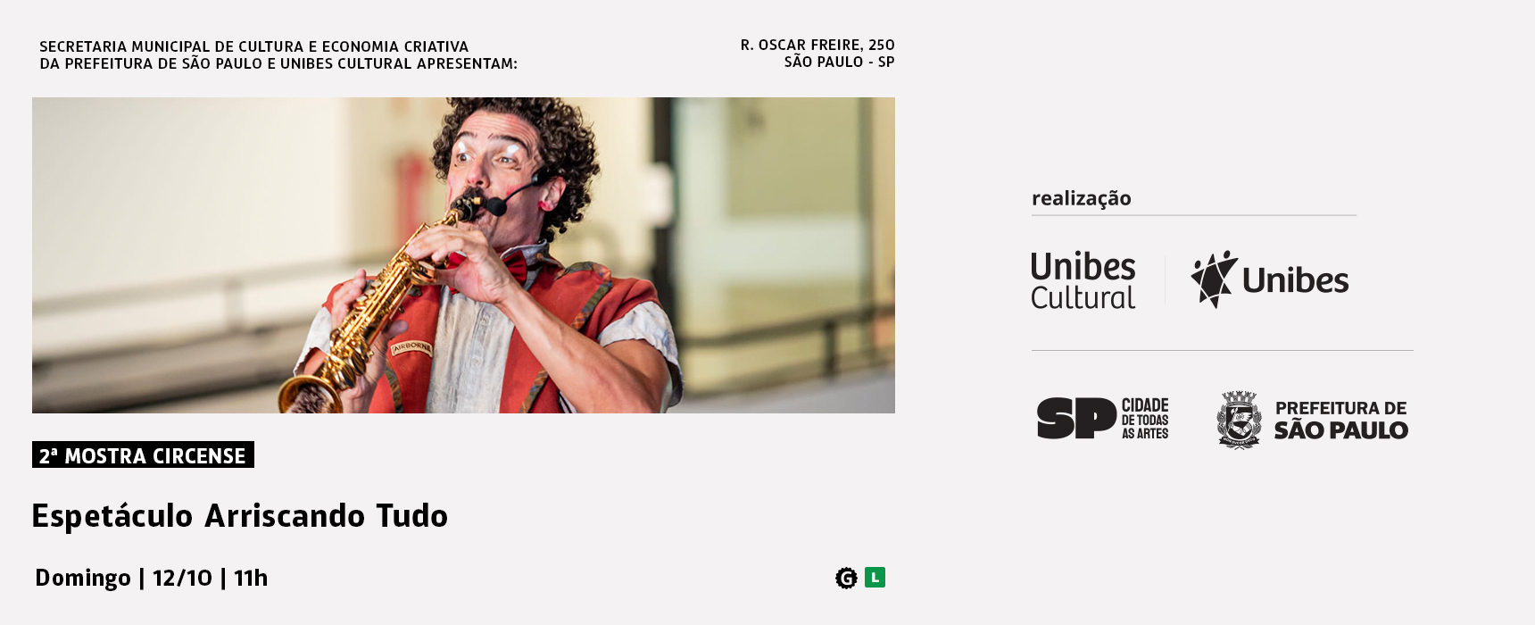 No dia 12 de outubro de 2025, às 11h, a 2ª Mostra Circense Unibes Cultural apresenta o espetáculo Arriscando Tudo!, com o Palhaço Mendonça (Filipe Bregantim). A montagem aborda o tema do risco por meio de habilidades circenses e da presença provocadora de Mendonça, que transforma situações cotidianas em experiências cheias de humor e tensão. Dos riscos mais simples aos mais complexos — perder a hora, perder um voo, sujar o sapato novo ou se apaixonar no ponto de ônibus —, o espetáculo mostra que o risco faz parte da vida e é o que a torna imprevisível e pulsante.