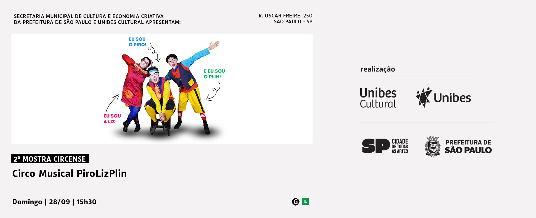 No dia 28 de setembro de 2025, às 15h30, a 2ª Mostra Circense Unibes Cultural apresenta o Circo Musical de PiroLizPlin, criado pela Cena IV – Shakespeare Cia. O espetáculo combina música, teatro e circo em uma experiência que celebra a imaginação, a amizade e o brincar. Por meio de um carrossel mágico que transforma histórias em músicas, os personagens Piro, Liz e Plin conduzem o público a uma jornada repleta de descobertas e aprendizados.