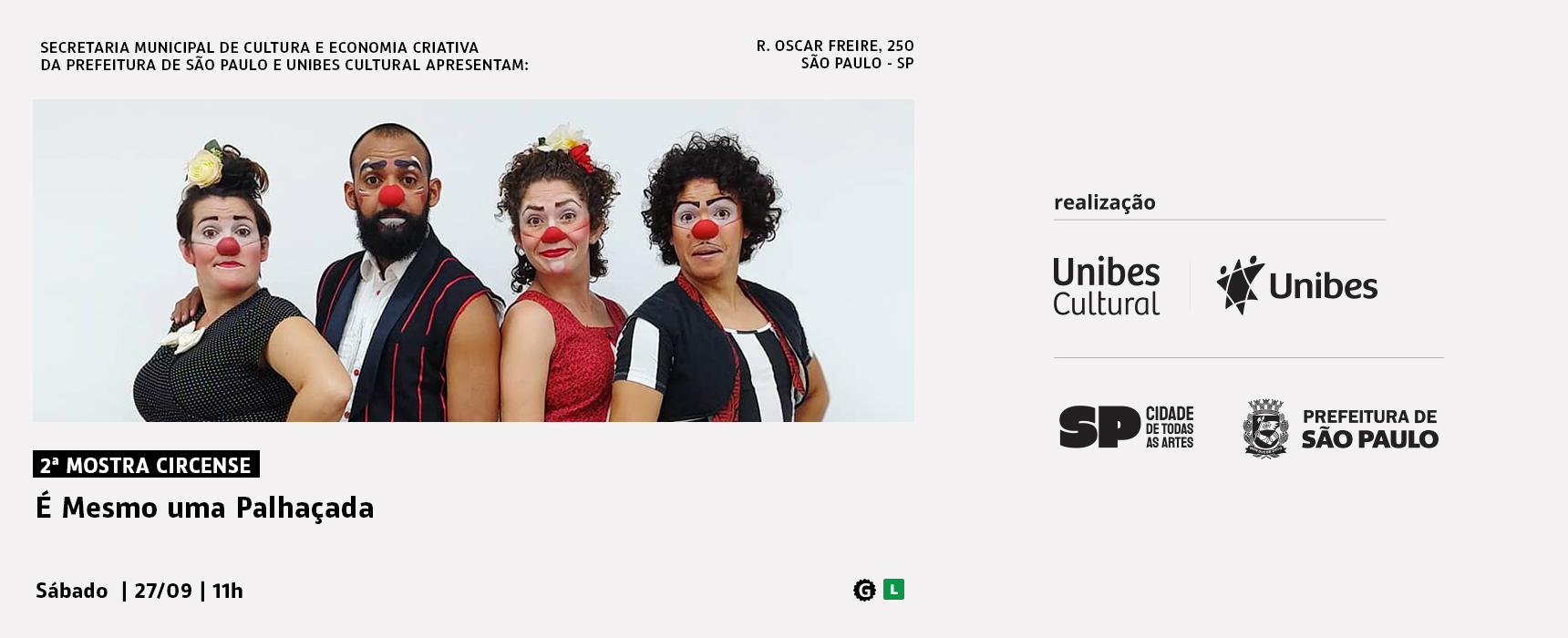 No dia 27 de setembro de 2025, às 11h, a 2ª Mostra Circense Unibes Cultural apresenta É Mesmo uma Palhaçada, um divertido espetáculo de variedades criado pela Trupe DuNavô. O enredo conta que, após uma suposta turnê internacional, um grupo de palhaças e palhaços chega para se apresentar, mas descobre que está no lugar errado. A partir dessa confusão, surgem números de mágica, dança, ilusionismo e cenas clássicas e autorais da palhaçaria, em uma celebração alegre e afetiva da memória do circo brasileiro. Com muita interação, humor e habilidade, o espetáculo convida o público a reviver o encanto dos grandes circos, fortalecendo a tradição da cultura popular.