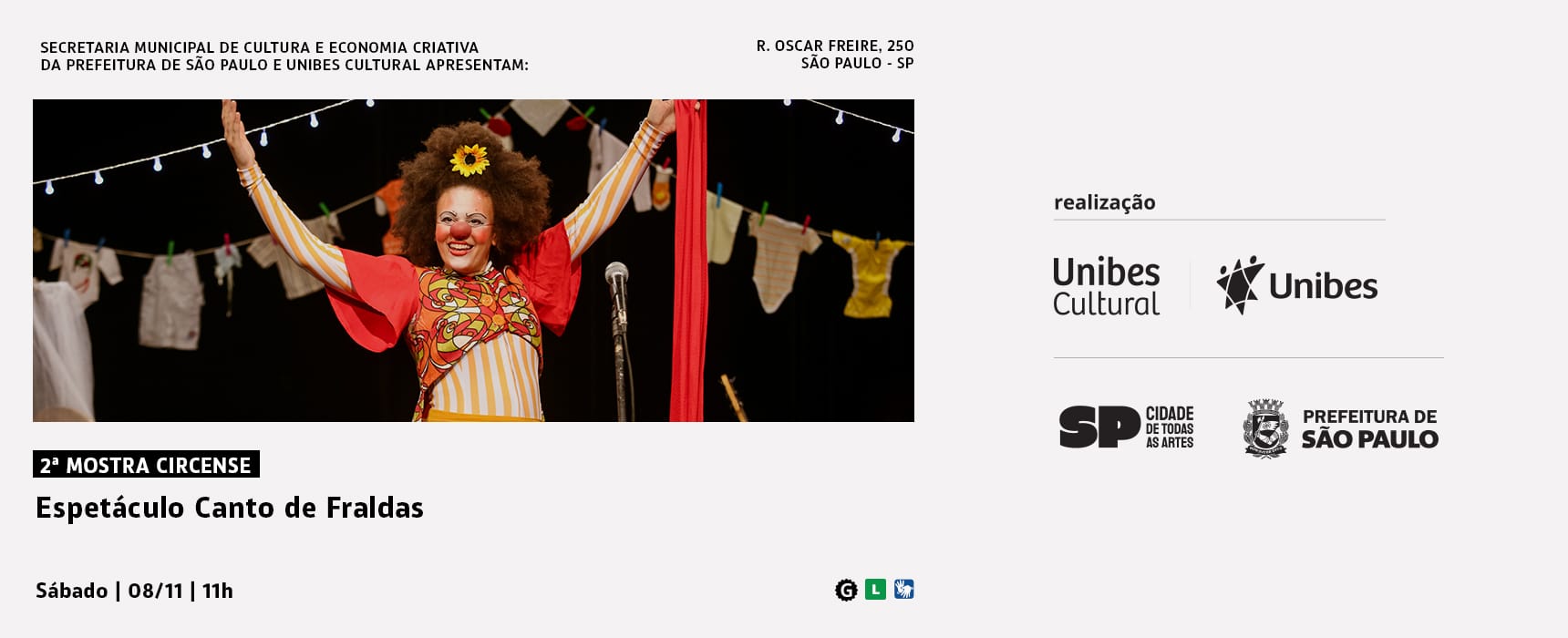No dia 8 de novembro de 2025, às 11h, a 2ª Mostra Circense apresenta o espetáculo Canto de Fraldas, mais uma história como tantas outras narrativas maternas. Utilizando paródias, jogos, interação e improviso, a Palhaça Xamanga traz para a cena uma parte desta mãe real e musical, na fase do puerpério. Em casa com seu neném, Xamanga (XaMÃEnga) conta e canta um pouco dos desafios diários, com palhaçaria e bom humor. Não é bem um conto de fadas, mas tem muito Canto de Fraldas!