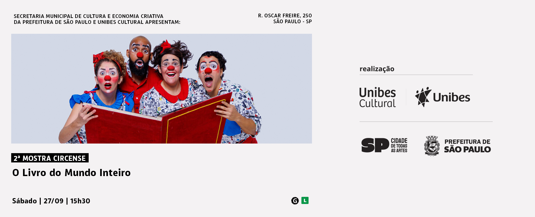 No dia 27 de setembro de 2025, às 15h30, a 2ª Mostra Circense Unibes Cultural apresenta o espetáculo O Livro do Mundo Inteiro, com a Trupe DuNavô. Tendo um livro como fio condutor, palhaças e palhaços convidam os espectadores a criarem juntos uma nova história a cada apresentação, registrando memórias, sentimentos e experiências. Com brincadeiras, escuta ativa e acolhimento, o espetáculo transforma o momento em uma construção coletiva e única, onde tudo nasce da interação direta com a plateia. Cada sessão é diferente: muda o lugar, mudam as pessoas, mudam as histórias, mas permanece o desejo de celebrar o encontro e fortalecer laços por meio da palhaçaria.