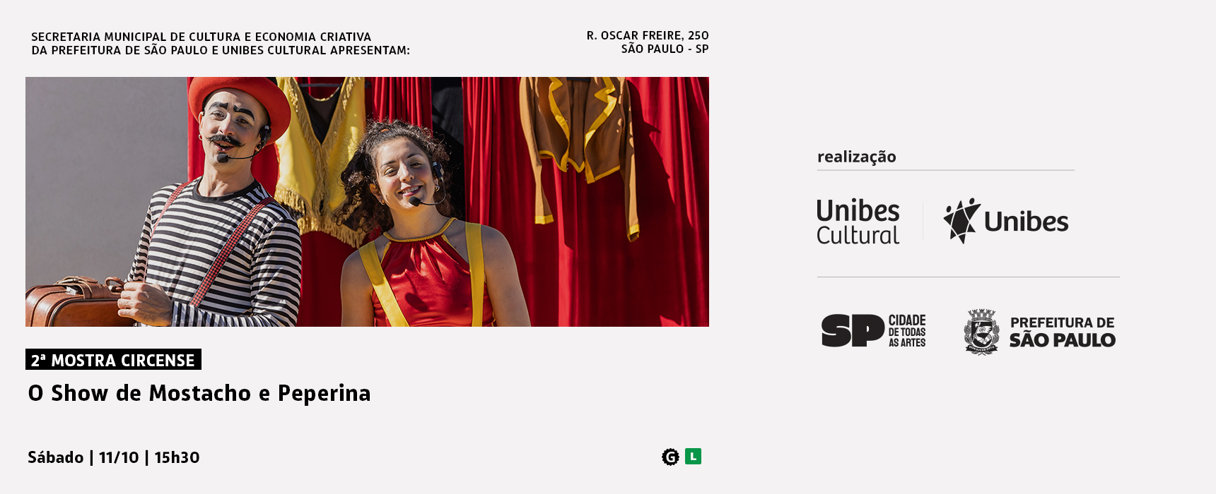 No dia 11 de outubro de 2025, às 15h30, a Cia. Circônicos apresenta O show de Mostacho e Peperina, um espetáculo de rua com alma latina e muito portunhol. Mostacho é o orgulhoso apresentador do “Melhor Circo do Mundo”, mas tudo sai do controle graças às trapalhadas da encantadora Peperina. Entre disputas acrobáticas e momentos de cumplicidade, a dupla descobre que trabalhar em equipe pode ser o verdadeiro segredo do sucesso. Repleto de humor, acrobacias, malabares e magia, o espetáculo convida o público a rir, se emocionar e participar ativamente da história.