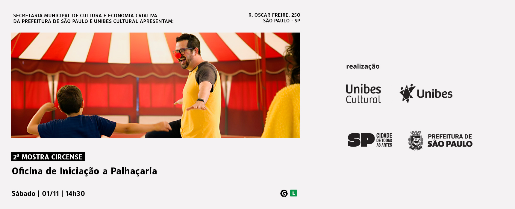 No dia 1º de novembro de 2025, às 14h30, acontece a Oficina de Iniciação a Palhaçaria, ministrada por Gabriel Marin. A atividade propõe um mergulho lúdico no universo da palhaçaria, com jogos e exercícios que estimulam o corpo, a expressão e a escuta, explorando o humor e a espontaneidade como caminhos de criação. Voltada a crianças de todas as idades e suas famílias, a oficina incentiva a descoberta do riso e da presença cênica em grupo.
