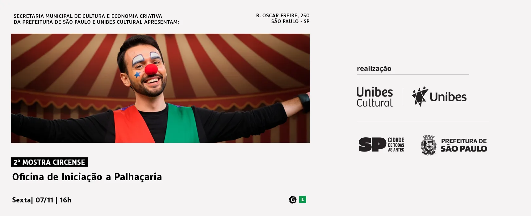 No dia 7 de novembro de 2025, às 16h, a 2ª Mostra Circense Unibes Cultural realiza mais uma Oficina de Iniciação a Palhaçaria, com o querido palhaço Plin (Vinicius Monteiro). A atividade propõe um mergulho lúdico no universo da palhaçaria, com jogos e exercícios que estimulam o corpo, a expressão e a escuta, explorando o humor e a espontaneidade como caminhos de criação. Voltada a crianças de todas as idades e suas famílias, a oficina incentiva a descoberta do riso e da presença cênica em grupo.