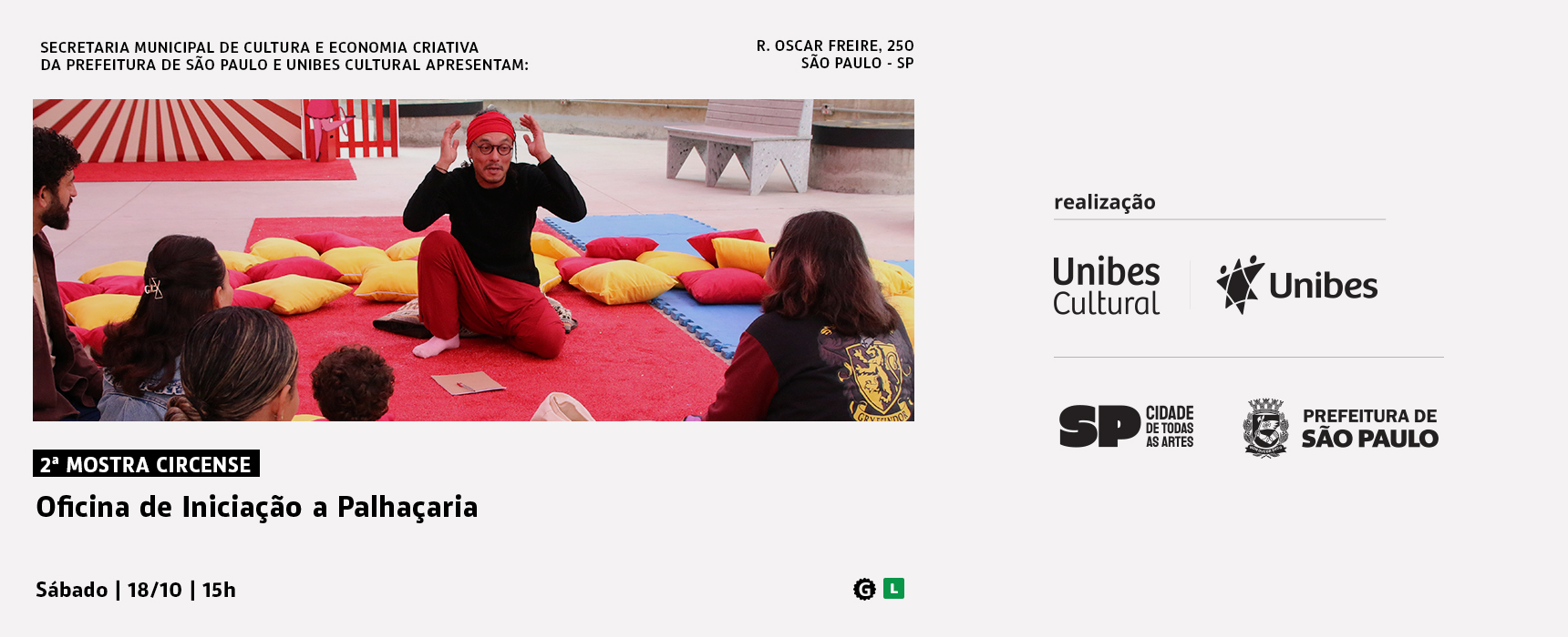 No dia 18 de outubro de 2025, às 15h, acontece a Oficina Infantil de Iniciação a Palhaçaria, ministrada por Hideo Kushiyama. Um encontro que combina exercícios corporais, expressivos e criativos, voltados para explorar o humor, a presença cênica e a conexão com o público. Voltado a crianças de todas as idades e suas famílias.