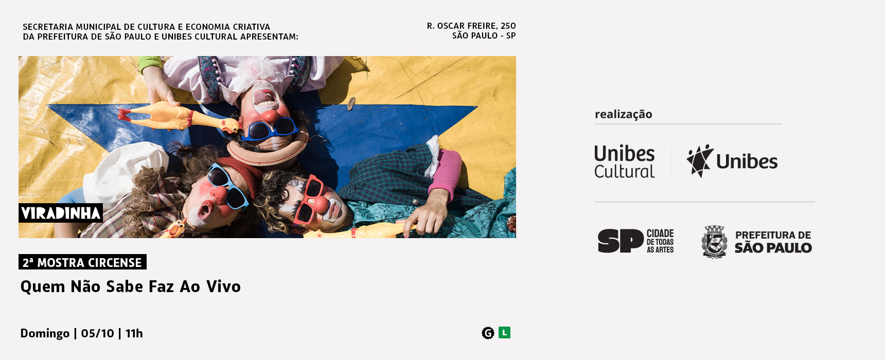 No dia 5 de outubro de 2025, às 11h, a 2ª Mostra Circense Unibes Cultural apresenta o espetáculo Quem Não Sabe Faz Ao Vivo, da Companhia do Bagaço. A montagem retrata, com humor e criatividade, a tentativa atrapalhada de três palhaças em preparar um espetáculo para o público. Entre tropeços e improvisos, o trio decide encenar, às pressas e ao gosto clownesco, um clássico da dramaturgia universal: Romeu e Julieta.