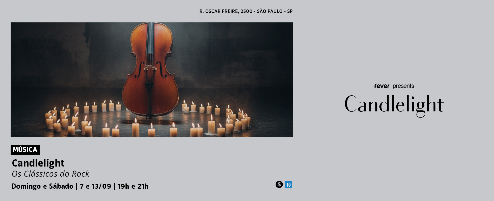 A série de concertos Candlelight apresenta espetáculos intimistas de música instrumental, criados pela plataforma global de entretenimento Fever para levar a magia da experiência musical ao vivo aos locais mais sublimes de São Paulo. Os concertos acontecem em ambientes iluminados à luz de velas, executados por diferentes formações orquestrais.