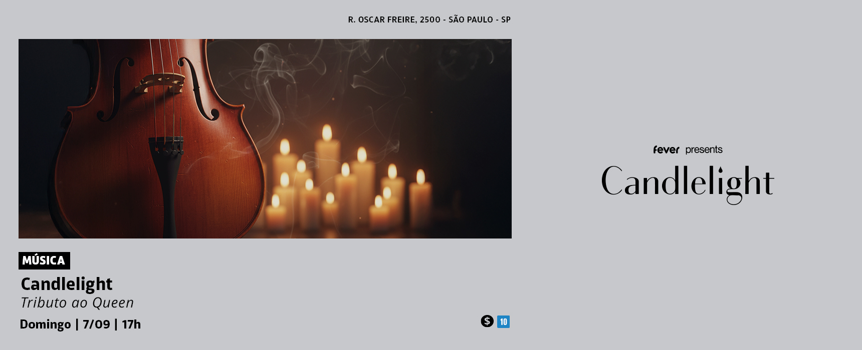 A série de concertos Candlelight apresenta espetáculos intimistas de música instrumental, criados pela plataforma global de entretenimento Fever para levar a magia da experiência musical ao vivo aos locais mais sublimes de São Paulo. Os concertos acontecem em ambientes iluminados à luz de velas, executados por diferentes formações orquestrais.