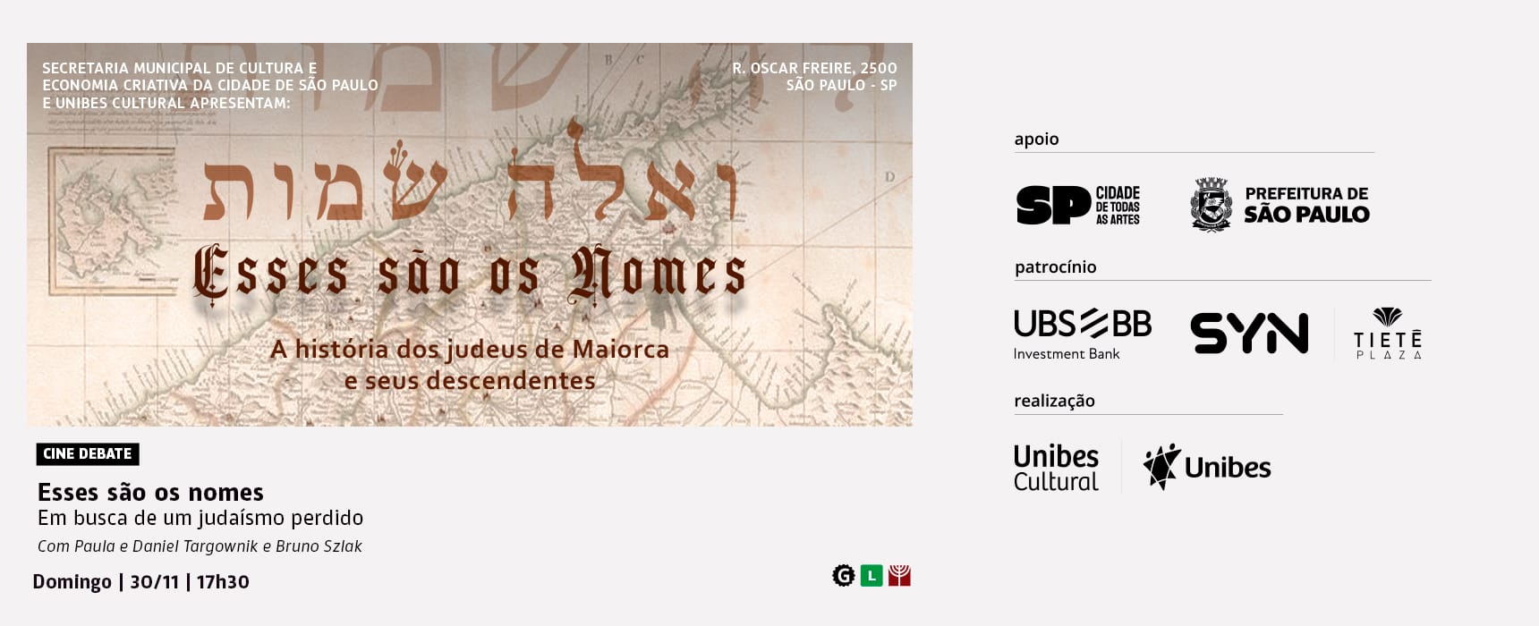 No dia 30 de novembro de 2025, às 17h30, acontece o filme Esses são os nomes, dirigido por Paula e Daniel Targownik. A obra narra a história dos criptojudeus de Palma de Mallorca, que se converteram ao cristianismo há mais de 600 anos, e de um rabino que busca reconduzi-los às suas raízes judaicas.