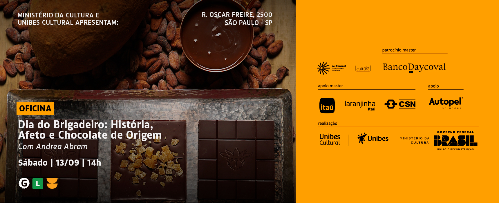 No sábado, 13 de setembro de 2025, às 14h, acontece a oficina cultural Dia do Brigadeiro: História, Afeto e Chocolate de Origem, dedicada ao doce mais emblemático do Brasil. A especialista Andrea Abram, da premiada Luisa Abram Chocolates, conduz o público em uma jornada que revela a origem e as curiosidades desse ícone afetivo, conectando sua trajetória à força e à diversidade do cacau brasileiro.
