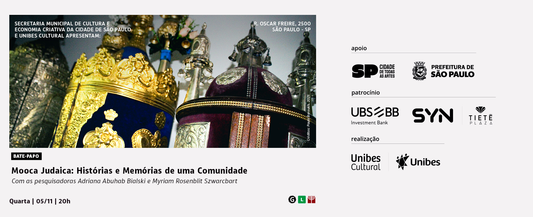 No dia 5 de outubro de 2025, às 20h, acontece um bate-papo sobre a exposição Mooca Judaica: histórias e memórias de uma comunidade com a participação das pesquisadoras Adriana Abuhab Bialski e Myriam Rosenblit Szwarcbart e do Grupo da Mooca. A mostra é um desdobramento do projeto Comunidade Judaica da Mooca e reúne fotografias, depoimentos e outros tantos registros que evidenciam a trajetória da comunidade judaica na Mooca, resgatando tradições, preservando e valorizando memórias vinculadas a um patrimônio cultural único e pouco conhecido.