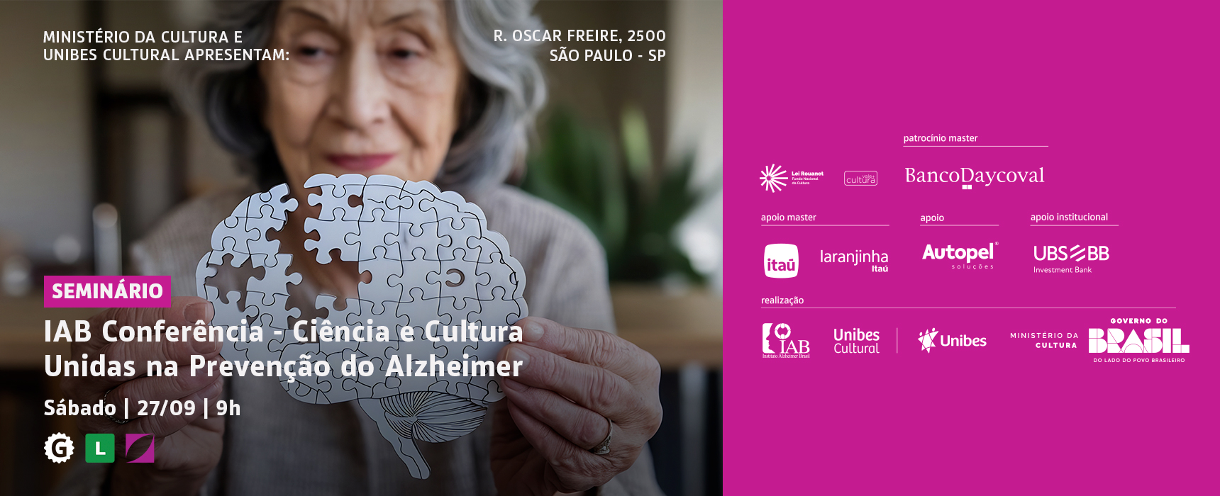 Em alusão ao Mês Mundial de Conscientização da Doença de Alzheimer, o Instituto Alzheimer Brasil (IAB), em parceria com a Unibes Cultural, realiza a IAB Conferência Ciência e Cultura Unidas na Prevenção do Alzheimer