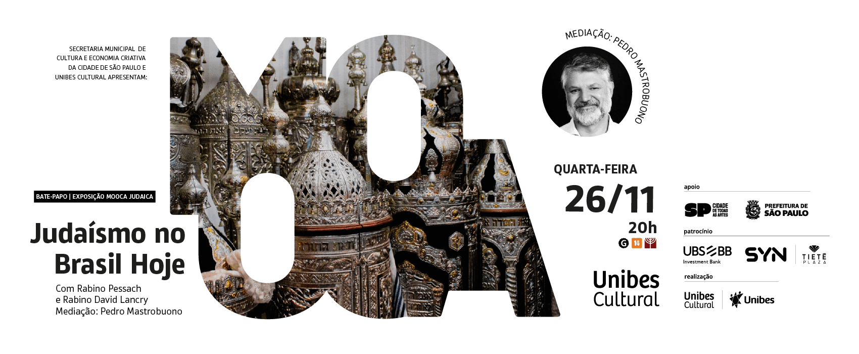 No dia 26 de novembro de 2025, às 20h, a Unibes Cultural realiza o bate-papo Judaísmo no Brasil Hoje, com a participação de Pedro Mastrobuono e dos rabinos Pessach e David Lancry. A conversa integra a programação paralela da exposição Mooca Judaica: histórias e memórias de uma comunidade, ampliando o olhar sobre a presença judaica no país e suas expressões contemporâneas. O encontro propõe uma reflexão sobre como o judaísmo se manifesta na vida comunitária, cultural e espiritual do Brasil atual, abordando temas como identidade, tradição, convivência e desafios da modernidade.