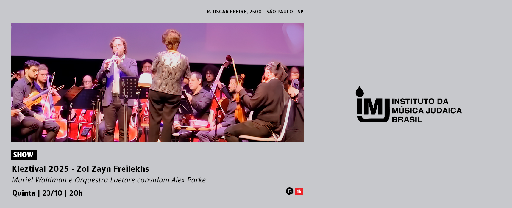 No dia 23 de outubro de 2025, às 20h, a Unibes Cultural recebe parte da programação do Kleztival 2025. A Orquestra de Cordas Laetare, regida por Muriel Waldman, se apresenta com o clarinetista solista Alex Parke. Sob o título Zol Zayn Freilekhs, este concerto resgata a vivacidade da música judaica em arranjos orquestrais e revela o diálogo entre tradição e contemporaneidade.