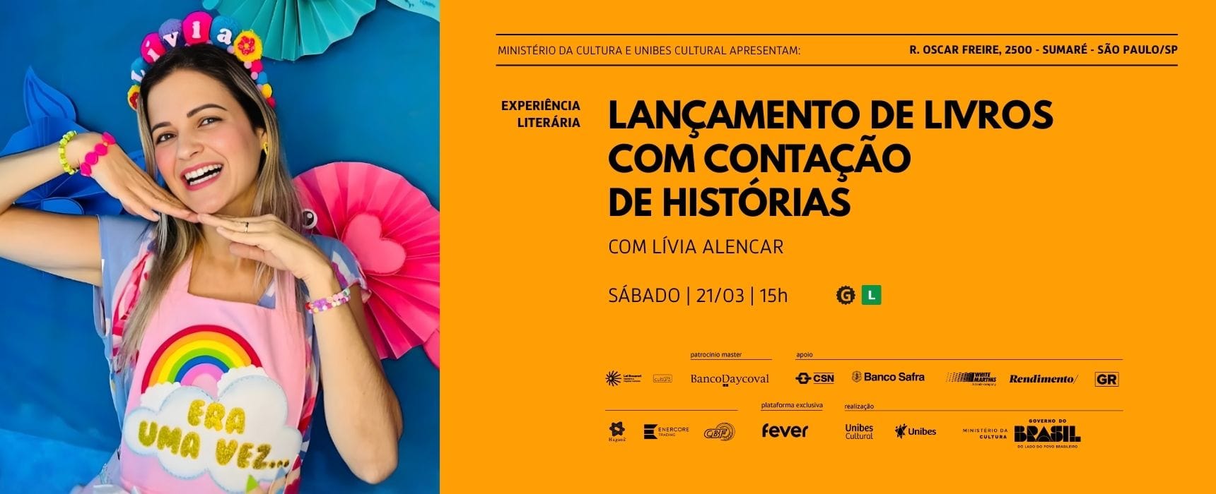 No dia 21 de março de 2026, a Unibes Cultural recebe a escritora Lívia Alencar para uma tarde de Lançamento de Livros com Contação de Histórias, um encontro voltado ao público infantil e às famílias, que combina leitura, escuta e mediação literária. A atividade propõe uma experiência que articula narrativa oral e literatura infantil como ferramentas de educação emocional e convivência.