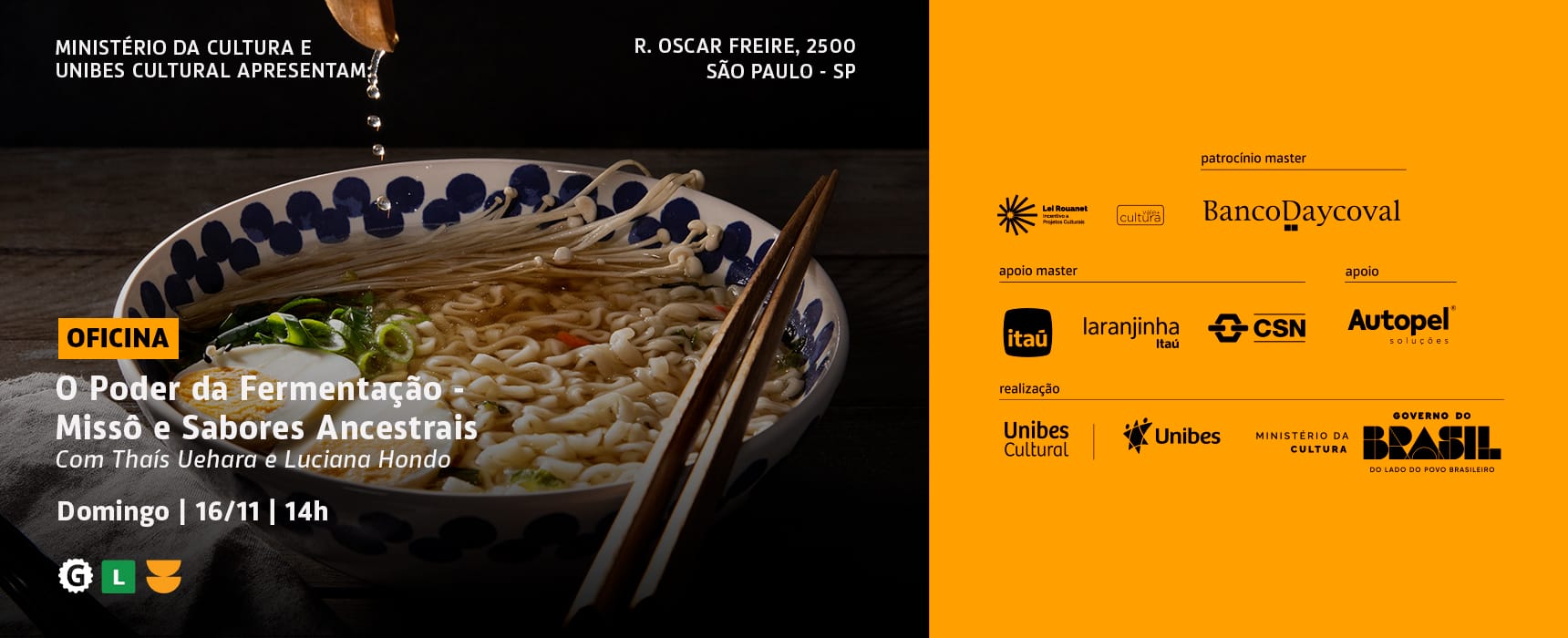 No dia 16 de novembro de 2025, às 14h, acontece a oficina cultural O Poder da Fermentação – Missô e Sabores Ancestrais, conduzida por Thaís Uehara e Luciana Hondo, fundadoras da Misso Karai. O público aprenderá sobre o universo do missô artesanal, um alimento ancestral que carrega tradição, microbiologia e sabor.