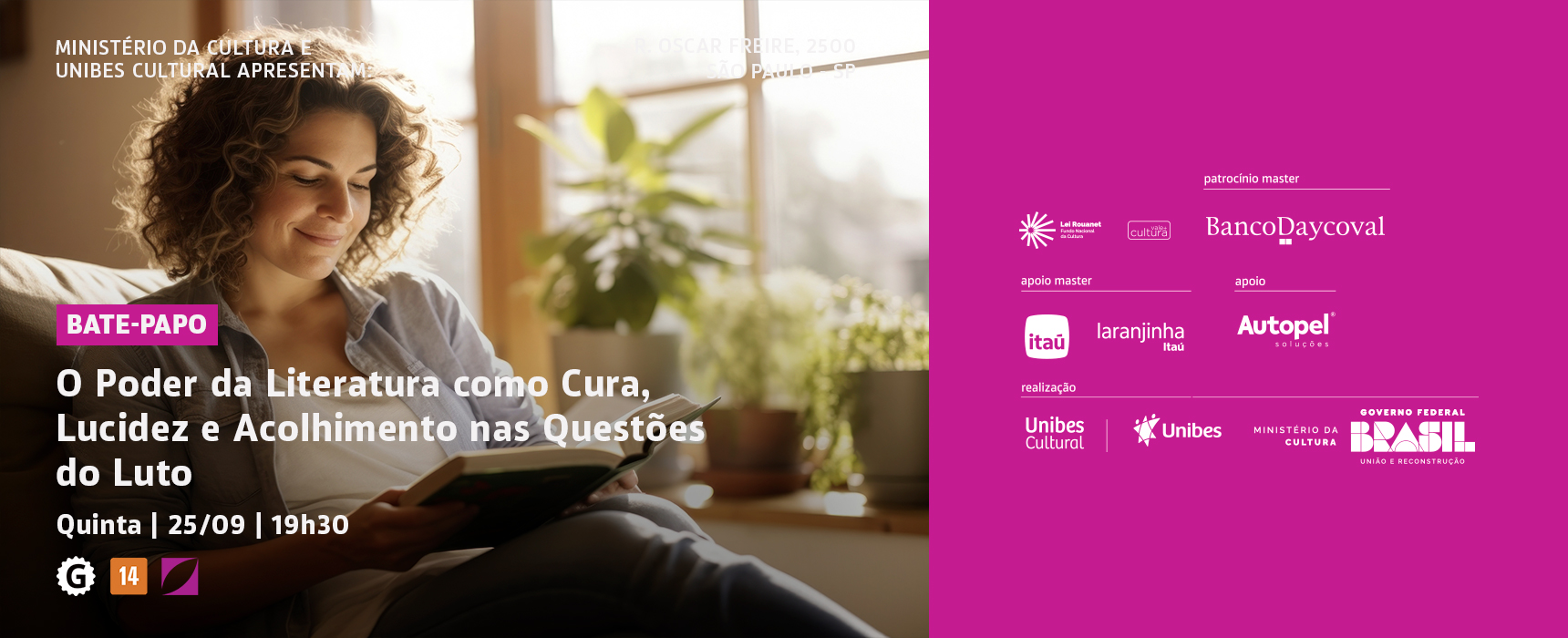 No dia 25 de setembro de 2025, às 19h30, acontece o encontro O Poder da Literatura como Cura, Lucidez e Acolhimento nas Questões do Luto, que propõe uma reflexão coletiva sobre a força transformadora da literatura ao abordar temas sensíveis, como o luto e o suicídio. As escritoras Juliana Batista, Luciana Coen e Sonia Consiglio, com mediação da editora Heloisa Belluzzo, se reúnem para discutir como a escrita e a leitura podem atuar como instrumentos de cura, empatia e lucidez, promovendo acolhimento e reflexão.