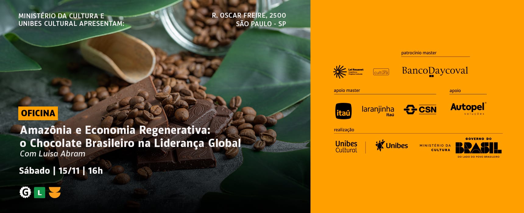 No sábado, 15 de novembro de 2025, às 16h, acontece a oficina cultural Amazônia e Economia Regenerativa: o Chocolate Brasileiro na Liderança Global, com a especialista Luisa Abram. A floresta amazônica é mais do que origem: é o coração pulsante de uma nova forma de fazer chocolate – regenerativa, colaborativa e profundamente brasileira.