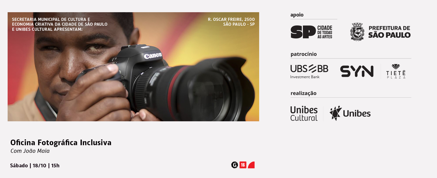No dia 18 de outubro de 2025, acontece a Oficina Fotográfica Inclusiva, ministrada pelo fotógrafo João Maia — em cartaz na exposição In.Visível. Os participantes serão convidados a experimentar novas maneiras de ver e sentir a fotografia. Utilizando o celular como ferramenta principal, a atividade propõe uma experiência que vai além do ato de enquadrar e clicar: trata-se de exercitar a percepção e compreender que tudo é possível quando a sensibilidade guia o olhar.