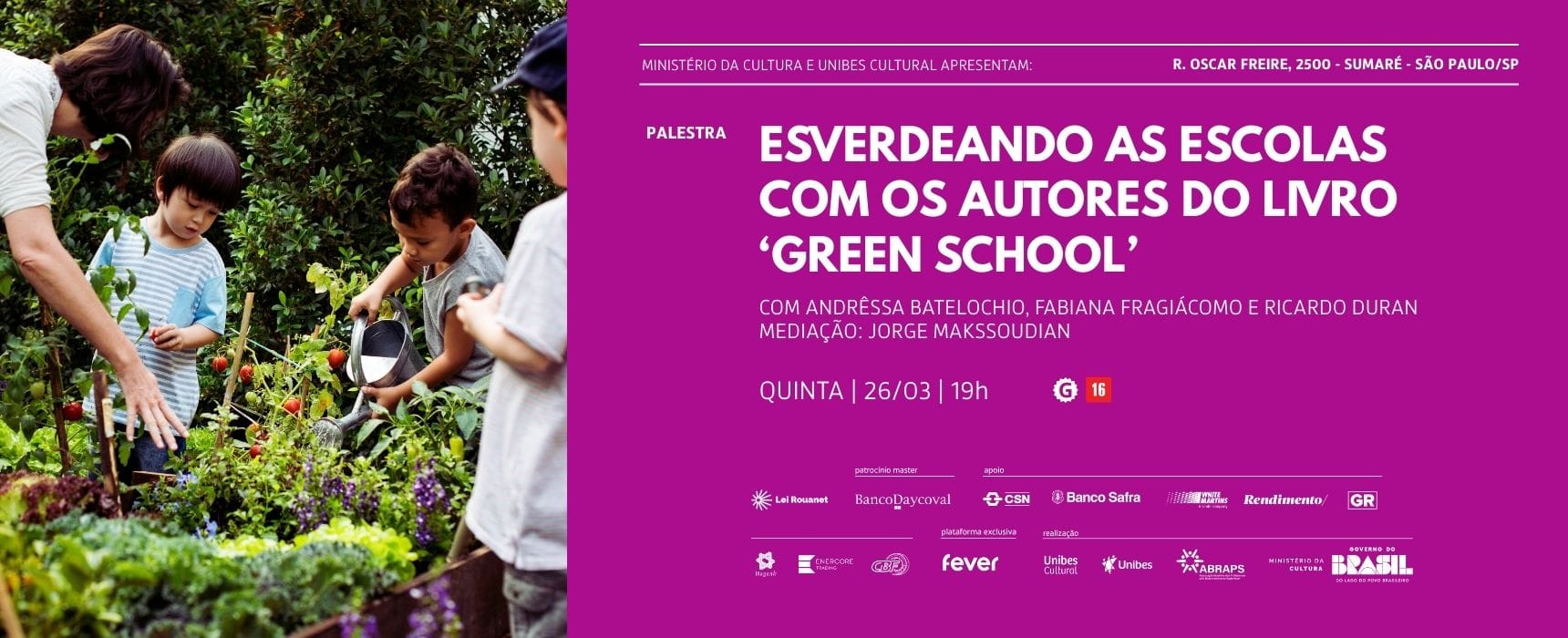 No dia 26 de março de 2026, a Unibes Cultural e a Abraps (Associação Brasileira dos Profissionais pelo Desenvolvimento Sustentável) realizam a palestra Esverdeando as Escolas, com Andrêssa Batelochio, Fabiana Fragiácomo e Ricardo Duran, autores do livro Green School – uma nova escola para a era da transição climática.