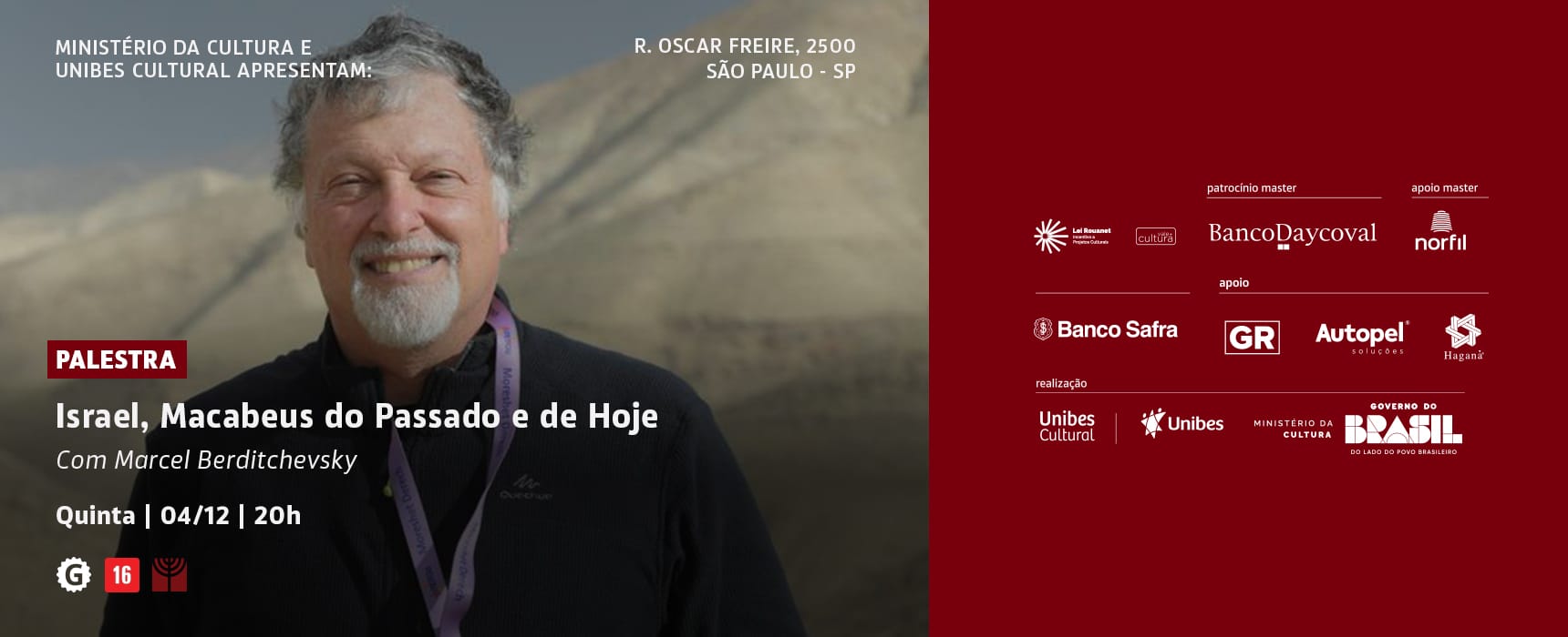 No dia 4 de dezembro de 2025, às 20h, acontece a palestra Israel, Macabeus do Passado e de Hoje, com o especialista Marcel Berditchevsky, que vive em Israel e tem longa trajetória na educação judaica e no turismo cultural.