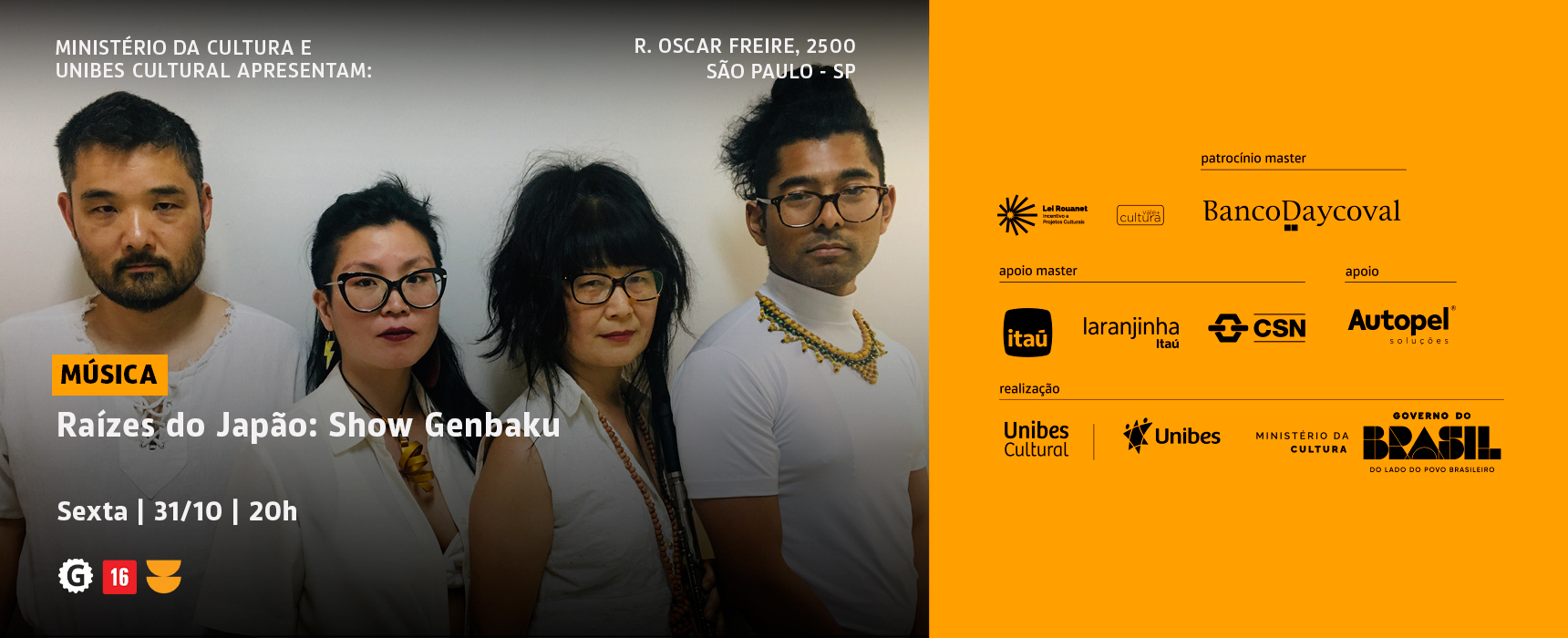 No dia 31 de outubro de 2025, às 20h, a Unibes Cultural apresenta Raízes do Japão: show “Genbaku”, um espetáculo que retrata o momento e as consequências das duas bombas atômicas que foram lançadas sobre as cidades de Hiroshima e Nagasaki em 1945 que mataram mais de 150 mil pessoas em poucos segundos.