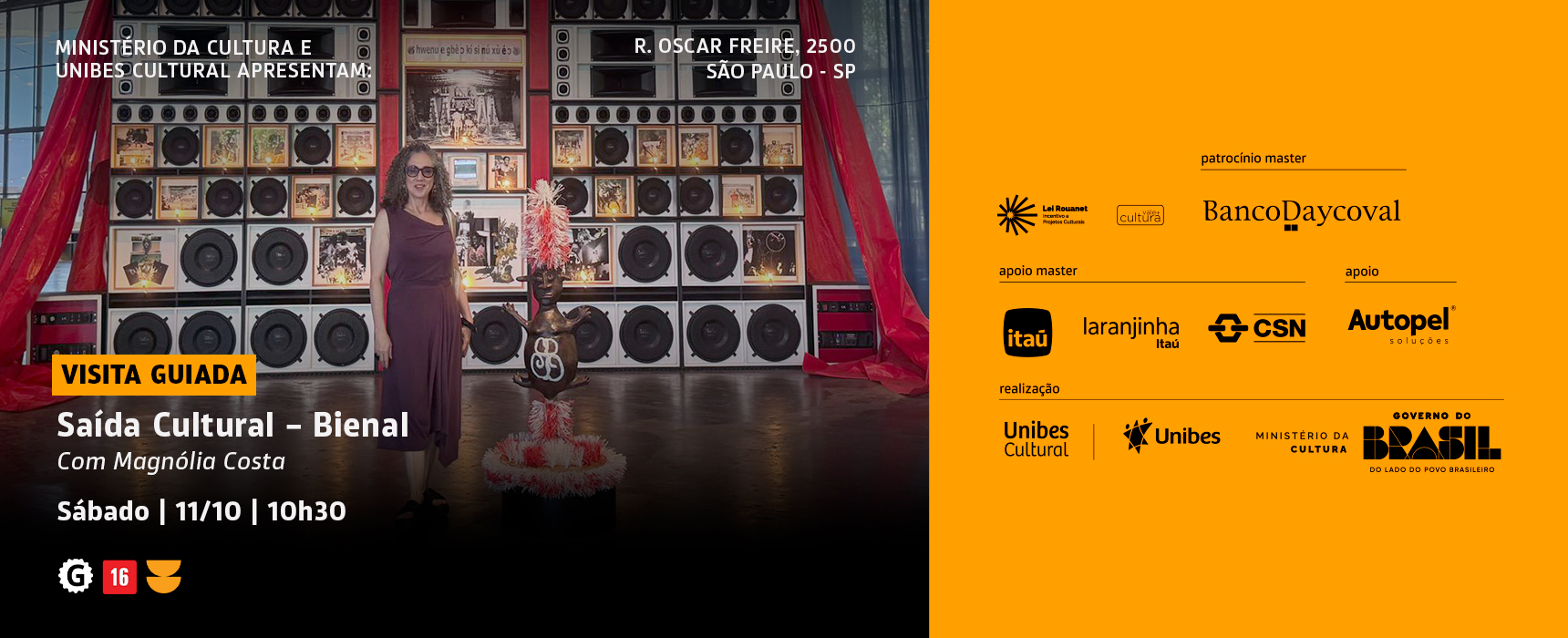 No dia 11 de outubro de 2025, a Unibes Cultural promove uma saída cultural à Bienal de São Paulo, conduzida por Magnólia Costa. A proposta é vivenciar a exposição a partir de uma visita guiada em movimento, em que a curadora comenta sobre obras e artistas em destaque.