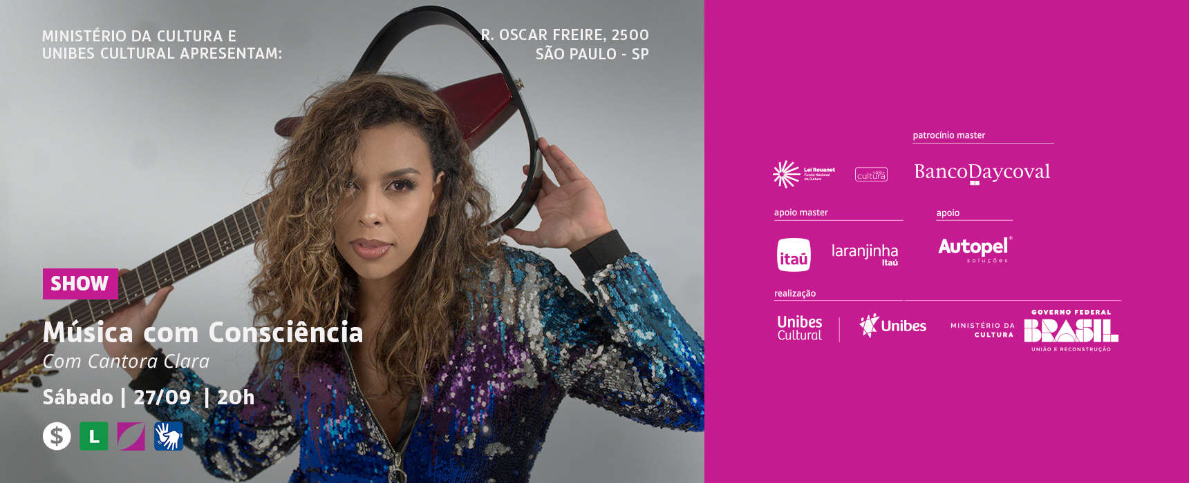 Esta programação faz parte do pilar ESG e Cultura e conta com patrocínio do Banco Daycoval e realização do Ministério da Cultura e Unibes Cultural por meio da Lei Federal de Incentivo à Cultura (Lei Rouanet).