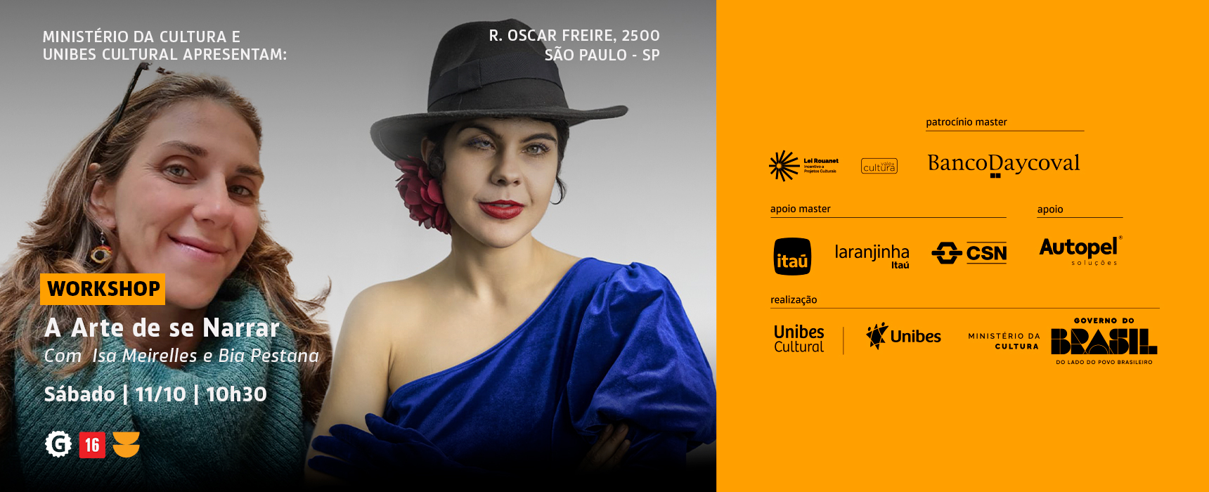 No dia 11 de outubro de 2025, Isa Meirelles e Bia Pestana conduzem o workshop A Arte de se Narrar, uma imersão em escrita, fala e presença, baseada em técnicas de teatro, autobiografia e comunicação pessoal. A atividade propõe um percurso de descoberta e expressão, para desbloquear a comunicação, ajudando os participantes a reconhecerem sua própria história como ferramenta de conexão e autenticidade.